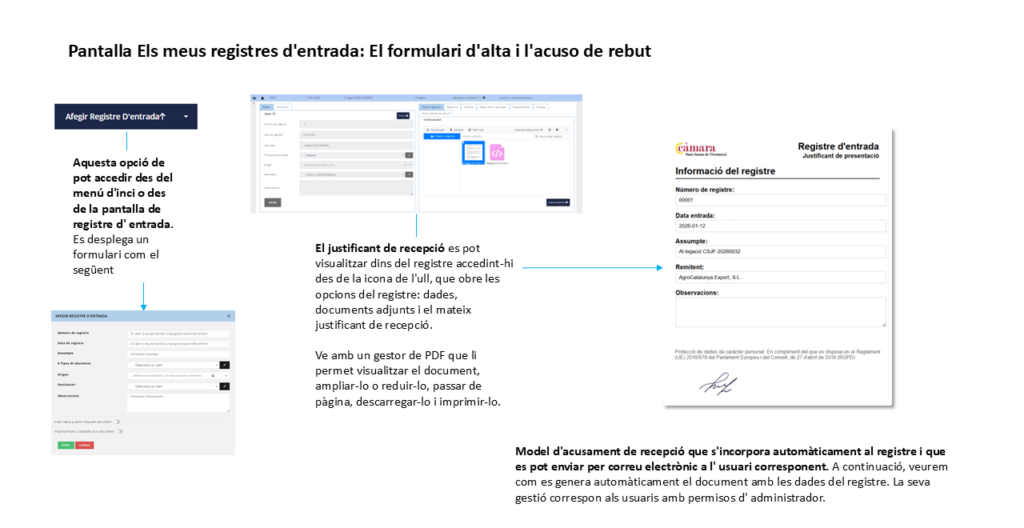 Pantalla “Els meus registres d’entrada”: formulari d’alta i acuse de rebut