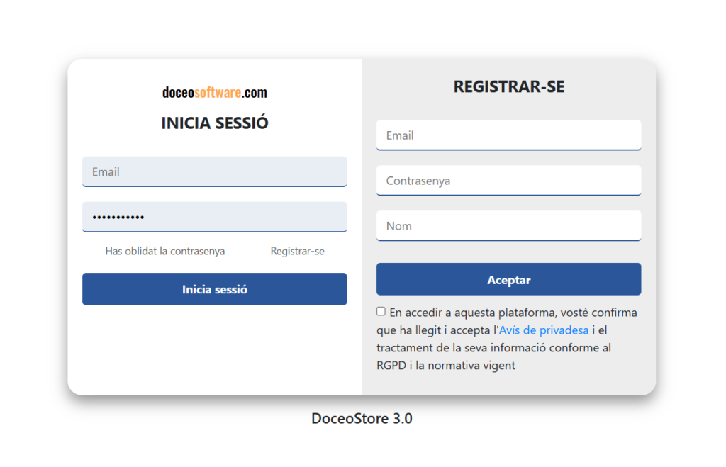 Doceo Portal Reg ofereix una pantalla d’inici de sessió adaptada a dos perfils d’usuari: Usuaris Interns i Usuaris Externs.
