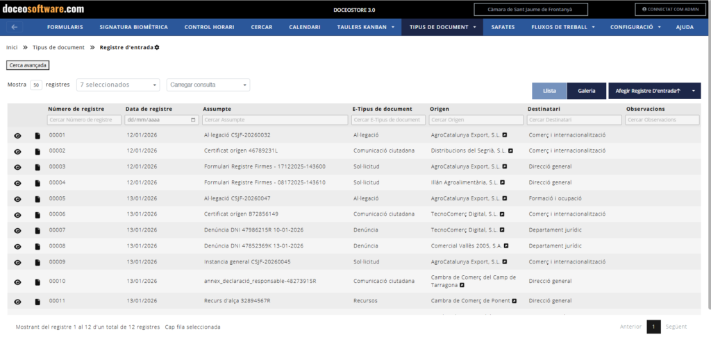 - Sortida i seguiment: els documents enviats quedin igualment registrats, amb confirmació de recepció i visibilitat controlada segons permisos d’usuari.