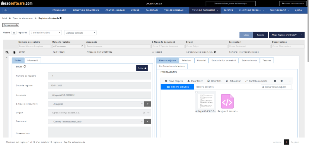 - Registre: els documents entrants es digitalitzen o es pugen al sistema i queden automàticament assignats a l’usuari corresponent.